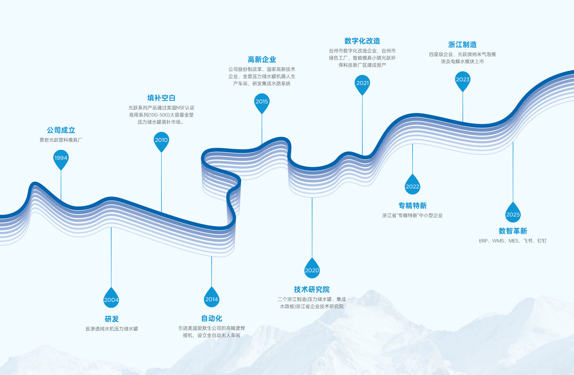浙江光跃环保科技股份有限公司成立于1994年,是一家股份制企业。公司立足净水行业,主营净水设备中集成水路系统、全密封塑料压力储水桶、开饮机及净水设备其他核心配件集研发、设计、模具、注塑、焊接为一体的专业定制服务。致力拓展成为覆盖智能家居、医疗器械、新能源汽车等领域的专业核心部件智造专家。